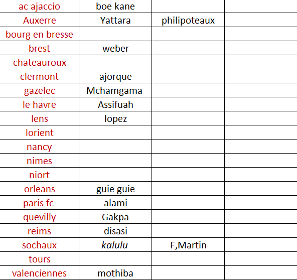 28 juillet 2017 at 18:48brest-chateauroux ( butin de brest ) nimes-reims ( alioui de nimes ) niort-ajaccio ( ndoh de niort ) orleans-nancy ( koura de nancy ) sochaux-bourg ( andriatsima de sochaux ) tours-le havre ( bouazza de tours ) vafc- gazelec ( cisse du gaz ) pfc-clermont ( dugimont de clermont ) lorient-quevilly ( courtet de lorient ) auxerre-lens ( sane d’auxerre )