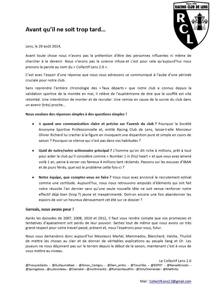 Le collectif Lens 2.0, un groupe de twittos fans du Racing Club de Lens, a envoyé une lettre ouverte a Gervais Martel et aux dirigeants du Racing.
